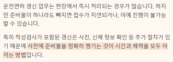 운전면허 갱신 업무는 현장에서 즉시 처리되는 경우가 많습니다. 하지만 준비물이 하나라도 빠지면 접수가 지연되거나, 아예 진행이 불가능할 수 있습니다. 특히 적성검사가 포함된 갱신은 사진, 신체 정보 확인 등 추가 절차가 있기 때문에 사전에 준비물을 정확히 챙기는 것이 시간과 체력을 모두 아끼는 방법입니다.