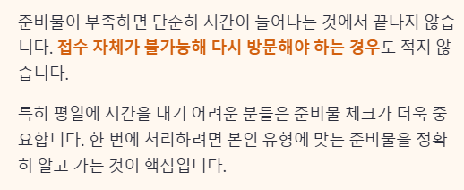 준비물이 부족하면 단순히 시간이 늘어나는 것에서 끝나지 않습니다. 접수 자체가 불가능해 다시 방문해야 하는 경우도 적지 않습니다. 특히 평일에 시간을 내기 어려운 분들은 준비물 체크가 더욱 중요합니다. 한 번에 처리하려면 본인 유형에 맞는 준비물을 정확히 알고 가는 것이 핵심입니다.
