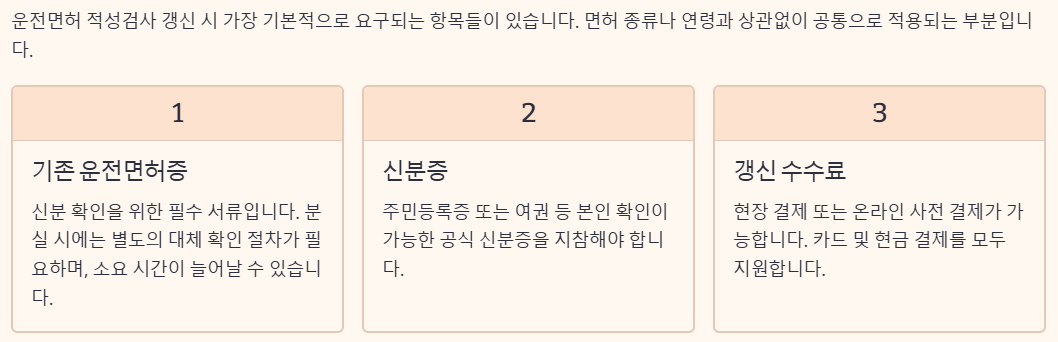 운전면허 적성검사 갱신 시 가장 기본적으로 요구되는 항목들이 있습니다. 면허 종류나 연령과 상관없이 공통으로 적용되는 부분입니다. 아래 표는 기본 준비물을 정리한 내용입니다.