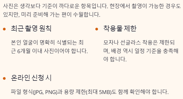 사진은 생각보다 기준이 까다로운 항목입니다. 현장에서 촬영이 가능한 경우도 있지만, 미리 준비해 가는 편이 수월합니다. 사진은 최근 촬영한 본인 얼굴이 명확히 식별되는 것이 기본 조건입니다. 모자나 선글라스 착용은 제한되며, 배경 역시 일정 기준을 충족해야 합니다. 온라인 신청을 병행하는 경우에는 파일 형식과 용량 제한도 함께 확인해야 합니다.