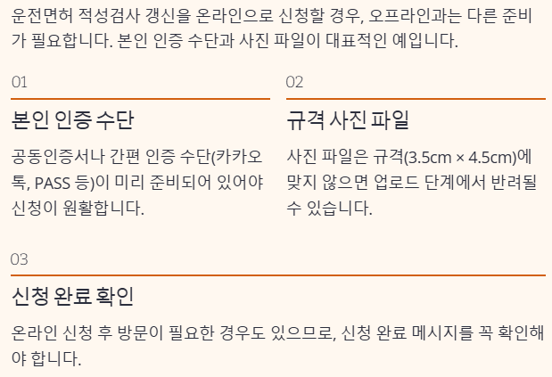 운전면허 적성검사 갱신을 온라인으로 신청할 경우, 오프라인과는 다른 준비가 필요합니다. 본인 인증 수단과 사진 파일이 대표적인 예입니다. 공동인증서나 간편 인증 수단이 미리 준비되어 있어야 신청이 원활합니다. 또한 사진 파일은 규격에 맞지 않으면 업로드 단계에서 반려될 수 있습니다. 온라인 신청 후 방문이 필요한 경우도 있으므로, 신청 완료 메시지를 꼭 확인해야 합니다.