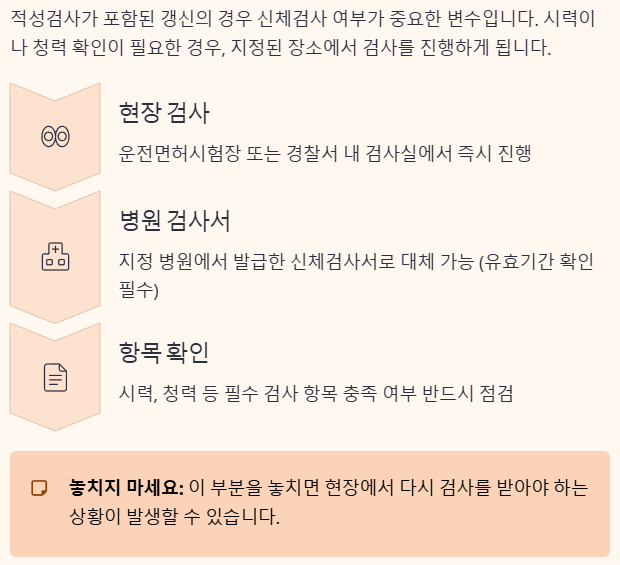 적성검사가 포함된 갱신의 경우 신체검사 여부가 중요한 변수입니다. 시력이나 청력 확인이 필요한 경우, 지정된 장소에서 검사를 진행하게 됩니다. 일부 경우에는 병원에서 발급한 신체검사서로 대체가 가능하기도 합니다. 이때는 검사 유효기간과 항목 충족 여부를 반드시 확인해야 합니다. 이 부분을 놓치면 현장에서 다시 검사를 받아야 하는 상황이 발생할 수 있습니다.