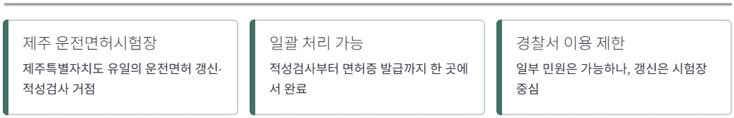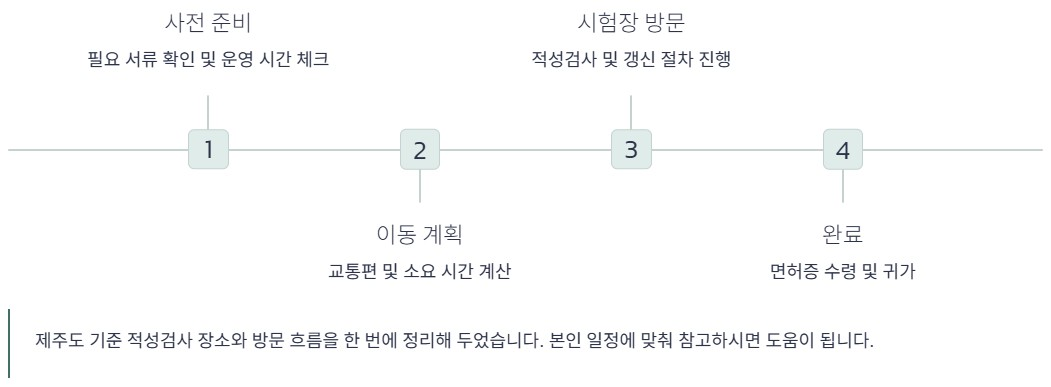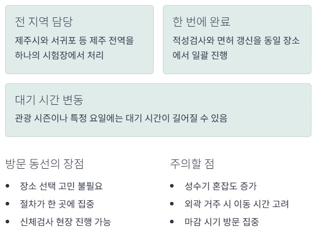 제주도는 단일 거점 구조로 운영됩니다. 운전면허 갱신과 적성검사는 제주 운전면허시험장을 중심으로 진행됩니다. 경찰서 이용보다는 시험장 방문이 기본 동선입니다.