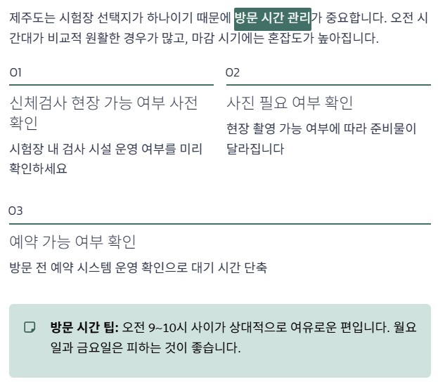 제주도는 시험장 선택지가 하나이기 때문에 방문 시간 관리가 중요합니다. 오전 시간대가 비교적 원활한 경우가 많고, 마감 시기에는 혼잡도가 높아집니다.