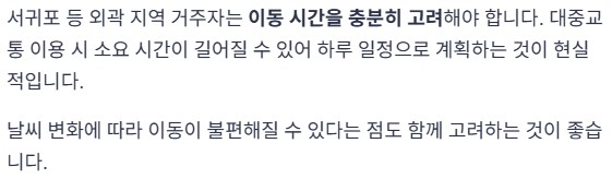 서귀포 등 외곽 지역 거주자는 이동 시간을 충분히 고려해야 합니다. 대중교통 이용 시 소요 시간이 길어질 수 있어 하루 일정으로 계획하는 것이 현실적입니다. 날씨 변화에 따라 이동이 불편해질 수 있다는 점도 함께 고려하는 것이 좋습니다.