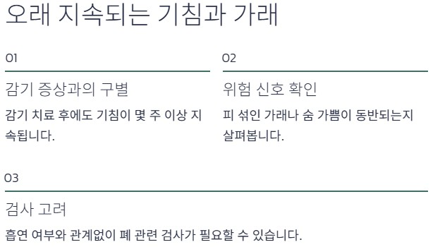 감기 치료 후에도 기침이 몇 주 이상 지속되고, 피 섞인 가래나 숨 가쁨이 동반된다면 폐 관련 검사가 필요할 수 있습니다. 흡연 여부와 관계없이 발생할 수 있다는 점도 기억해야 합니다.