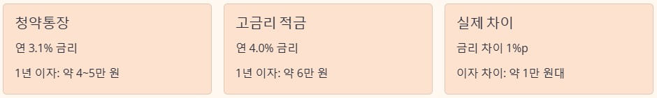 이 경우 청약통장 연 3.1% 적용 시 1년 이자는 약 4만~5만 원 수준, 시중 고금리 적금 연 4.0% 적용 시 약 6만 원 내외로 계산됩니다. 즉, 금리 차이 약 1% p 기준으로 1년 이자 차이는 1만 원대에 그치는 경우가 많습니다. 단순히 이자만 놓고 보면, 생각보다 격차가 크지 않다는 점을 확인할 수 있습니다.
