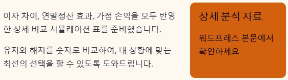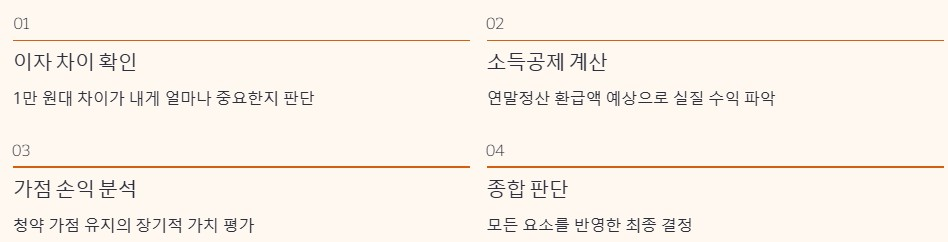 이자 차이, 연말정산 효과, 가점 손익을 모두 반영해 유지와 해지를 숫자로 비교한 시뮬레이션 표 등 더 자세한 정보는 아래를 참고하세요.