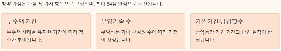 이 세 항목을 합산해 84점 만점으로 계산되며, 서울·수도권 주요 단지는 60점 이상이 커트라인이 되는 경우도 많습니다.
