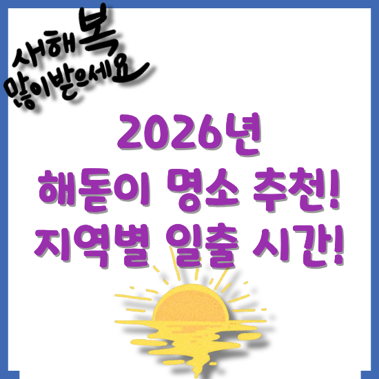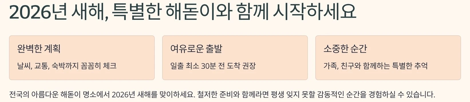 2026년 해돋이 : 새해를 맞는 해돋이 구경은 많은 이들에게 중요한 행사입니다. 본 가이드는 12월 말부터 1월 1일까지 폭증하는 해돋이 명소 및 일출 시간 검색 수요에 맞춰, 전국 주요 해돋이 명소