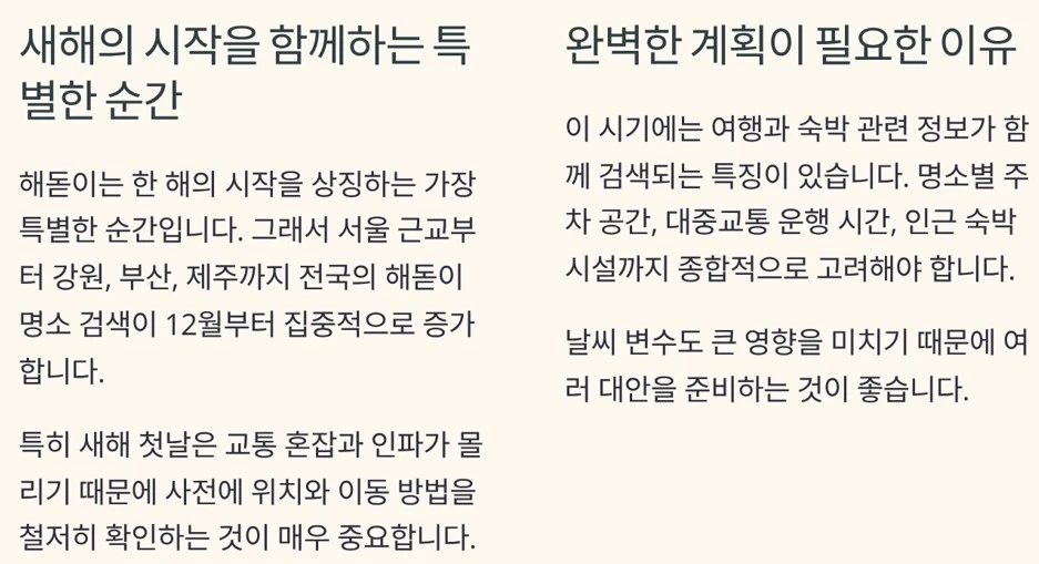 해돋이는 한 해의 시작을 상징하는 특별한 순간입니다. 그래서 서울 근교부터 강원, 부산, 제주까지 해돋이 명소 검색이 집중됩니다. 특히 새해 첫날은 교통 혼잡과 인파가 몰리기 때문에 사전에 위치와 이동 방법을 확인하는 것이 중요합니다. 이 시기에는 여행과 숙박 관련 정보가 함께 검색되는 특징도 있습니다.