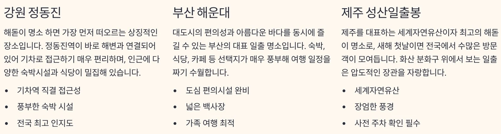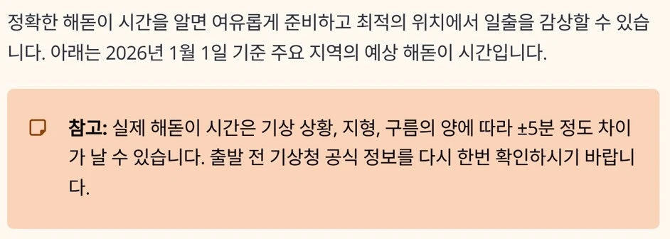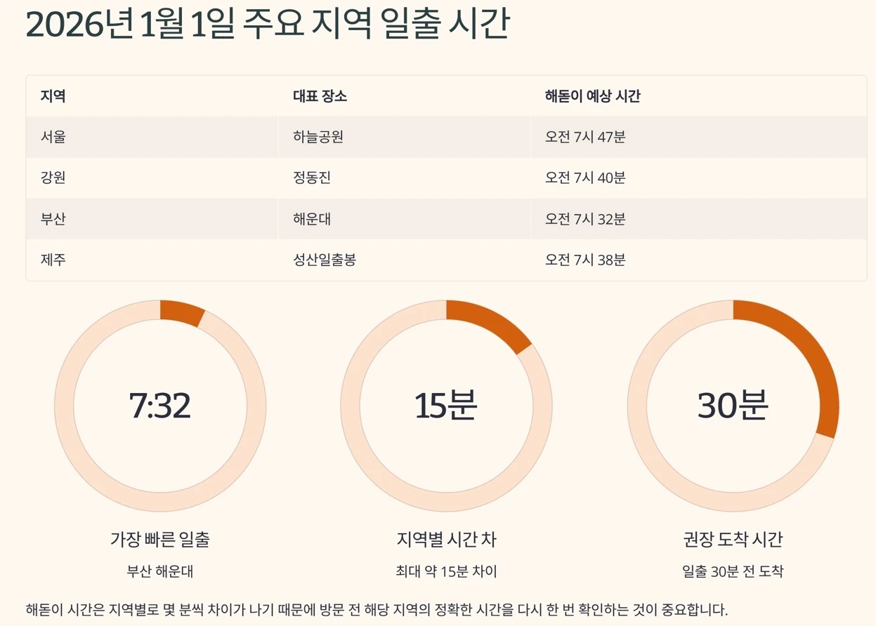아래는 1월 1일 기준 주요 지역의 대략적인 해돋이 시간입니다. 실제 시간은 기상 상황에 따라 달라질 수 있습니다.