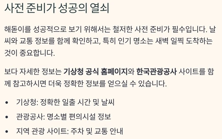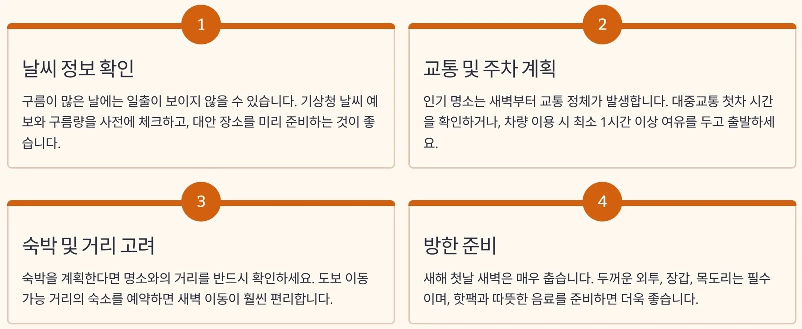 해돋이를 보러 갈 때는 날씨와 교통 정보를 함께 확인해야 합니다. 구름이 많은 날에는 일출이 보이지 않을 수 있고, 인기 명소는 새벽부터 정체가 발생합니다. 숙박을 계획한다면 명소와의 거리도 함께 고려하는 것이 좋습니다. 보다 자세한 정보는 공식 기상 정보와 관광 안내 사이트를 함께 참고하시면 도움이 됩니다.