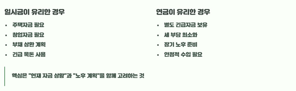 당장 주택자금, 창업자금, 부채 상환 등 목돈 사용 계획이 있다면 일시금이 더 합리적일 수 있습니다. 반대로 별도의 긴급 자금이 필요하지 않다면, 세 부담을 나눌 수 있는 연금 방식이 유리한 선택이 될 가능성이 높습니다. 핵심은 “현재 자금 상황”과 “노후 계획”을 함께 고려하는 것입니다.