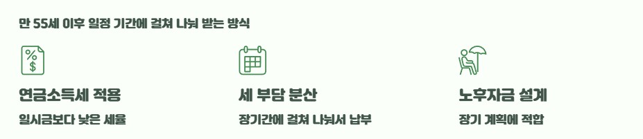연금 방식은 퇴직금을 IRP 계좌로 이전한 뒤, 만 55세 이후 일정 기간에 걸쳐 나눠 받는 구조입니다.