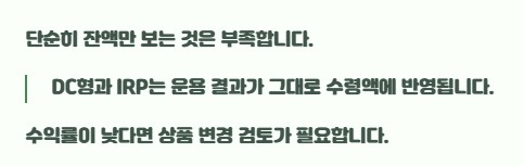 DC형과 IRP는 운용 결과가 그대로 수령액에 반영됩니다. 수익률이 낮다면 상품 변경이 필요한지 검토해야 합니다.