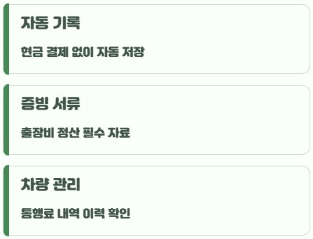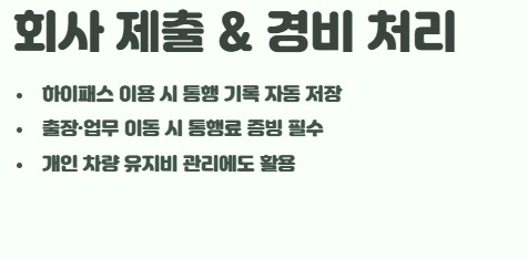 하이패스를 사용하면 별도의 현금 결제가 없기 때문에 통행 기록이 자동으로 저장됩니다. 그래서 회사 출장이나 업무 이동 시에는 통행료 증빙을 위해 영수증을 출력하는 경우가 많습니다. 또한 개인적으로도 차량 유지비를 관리할 때 통행료 기록을 확인하는 용도로 활용되기도 합니다.