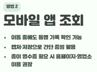 스마트폰에서도 하이패스 사용 내역을 확인할 수 있습니다. 모바일 앱을 이용하면 이동 중에도 통행 기록을 확인할 수 있고 필요한 경우 캡처 또는 저장도 가능합니다. 다만 실제 종이 영수증이 필요한 경우에는 홈페이지 출력이나 영업소 발급을 이용하는 경우가 많습니다. 요즘은 모바일 확인만으로도 간단한 사용 내역 증빙이 가능한 경우가 있어 상황에 따라 선택하면 됩니다.