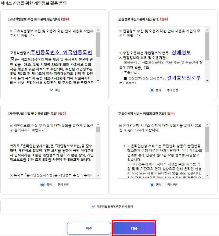 내용을 잘 읽어 보신 후 모든 란에 체크 후 다음으로 넘어갑니다.