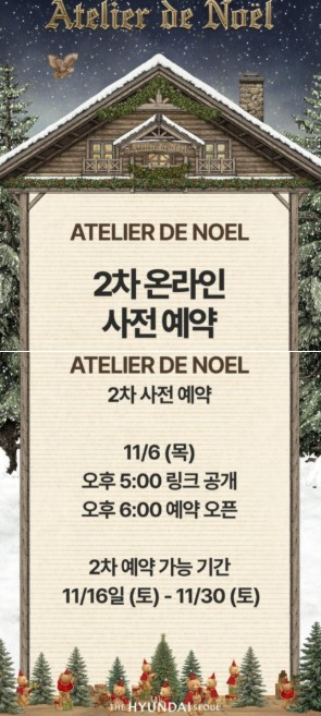 2025 더현대 크리스마스 팝업 '아틀리에 드 노엘' 1차 예약 실패하셨나요? 2차 예약을 노려보세요! 2차 예약 일정과 예약 방법, 성공하는 꿀팁을 정리했습니다. 서울에서 가장 먼저 크리스마스 분위기를 만날 수 있는 곳, 바로 여의도 더현대 서울입니다.