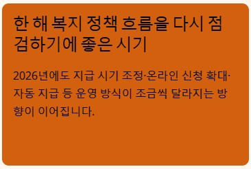 2026년에는 복지 정책 전반에서 온라인 신청 확대와 자동 연계 방식이 더 강화되는 흐름이 이어지고 있습니다. 일부 제도는 별도 신청 없이 자격 유지 시 자동 지급이나 자동 재충전 방식이 적용되며, 명절 전후로 지급 일정이 앞당겨지는 사례도 있습니다. 다만 이런 변화는 전국 공통이 아닌 경우도 많아, 본인이 속한 지자체 기준 확인이 중요합니다.