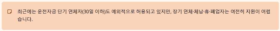 최근에는 운전자금 일부 단기 연체자(30일 이하)를 예외적으로 허용하는 등 대상이 조금씩 넓어지고 있지만, 장기 연체자·체납자·휴·폐업자는 여전히 지원이 어렵다는 점은 같다고 보시면 됩니다.