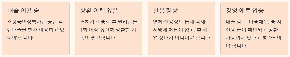 - 소상공인정책자금 공단 직접대출을 이용 중일 것