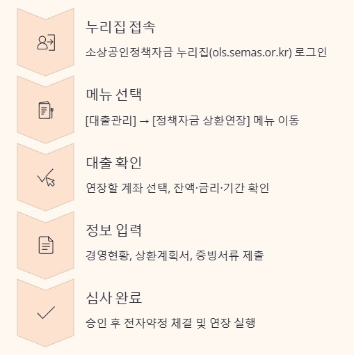 - 접수 후 심사 → 승인 통보 → 전자약정 체결 후 상환연장 실행