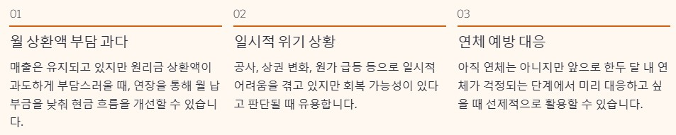 - 아직 연체는 아니지만, 앞으로 한두 달 내 연체가 걱정되는 단계에서 미리 대응하고 싶을 때