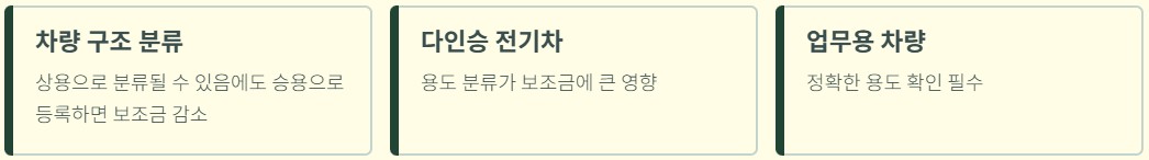 차량 구조상 상용으로 분류될 수 있음에도 승용으로 등록하면 보조금이 줄어들 수 있습니다. 특히 다인승 전기차나 업무용 차량은 용도 분류가 보조금에 큰 영향을 줍니다.