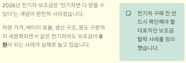 2026년 전기차 보조금은 ‘전기차면 다 받을 수 있다’는 개념이 완전히 사라졌습니다. 차량 가격, 배터리 효율, 생산 구조, 용도 구분까지 세분화되면서 같은 전기차라도 보조금이 0원이 되는 사례가 실제로 늘고 있습니다. 전기차 구매 전 반드시 확인해야 할 대표적인 보조금 탈락 사례를 정리해 봤습니다.