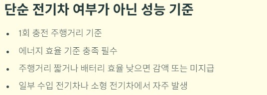 보조금은 단순 전기차 여부가 아니라 1회 충전 주행거리, 에너지 효율 기준을 함께 봅니다. 주행거리가 짧거나 배터리 효율이 낮은 차량은 감액 또는 미지급 대상이 됩니다. 특히 일부 수입 전기차나 소형 전기차에서 이 문제가 자주 발생합니다.