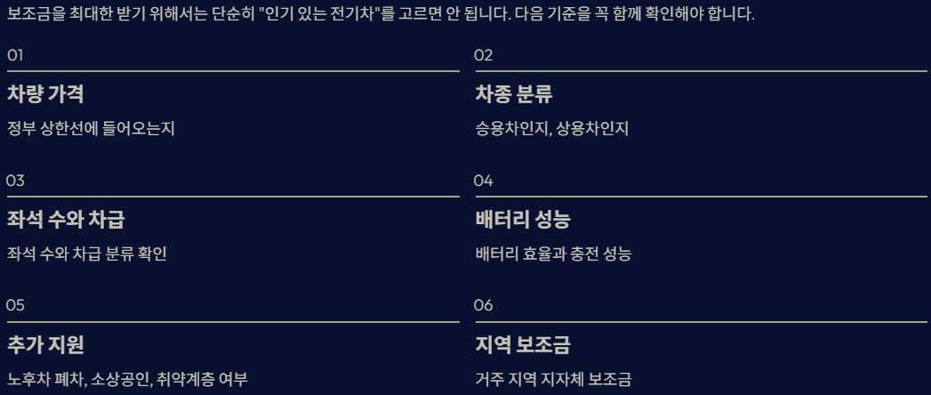 보조금을 최대한 받기 위해서는 단순히 “인기 있는 전기차”를 고르면 안 됩니다. 다음 기준을 꼭 함께 확인해야 합니다.