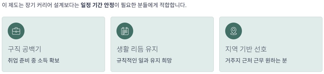 이 제도는 장기 커리어 설계보다는 일정 기간 안정이 필요한 분들에게 적합합니다. 구직 활동 중 공백을 메우거나 생활 리듬을 유지하고 싶은 경우 활용도가 높습니다. 지역 기반 활동을 선호하는 분들에게도 부담이 적은 편입니다.