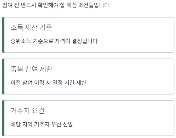 정부보조금 공공근로 및 지역 일자리는 소득 기준과 재산 기준이 함께 적용되는 경우가 많습니다. 또한 중복 참여 제한이 있어 이전 참여 이력이 있다면 일정 기간 신청이 어려울 수 있습니다. 단순히 일자리가 필요하다고 바로 참여할 수 있는 구조는 아니라는 점을 이해하는 것이 중요합니다.