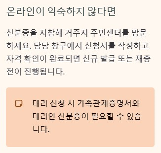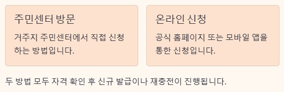 신청 방법 자체는 어렵지 않지만, 본인에게 맞는 방식을 선택하는 것이 중요합니다. 주민센터 방문이 편한지, 온라인 신청이 가능한지, 자동 재충전 대상인지 미리 정리해 두면 불필요한 시간 낭비를 줄일 수 있습니다. 주민센터 신청 절차와 온라인 발급 방법, 자동 재충전 조건을 묶어 정리한 상세 안내는 아래를 참고하세요.