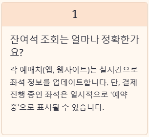 - 첫째, 잔여석은 실시간으로 확인되나요? 예매처 기준으로 실시간 반영됩니다.