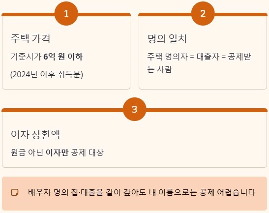- 주택 명의자 = 대출자 = 공제받는 사람이 원칙이라, 배우자 명의 집·대출을 내가 같이 갚아도 내 이름으로는 공제받기 어렵습니다.