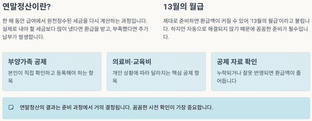 연말정산을 어렵게 느끼는 이유는 한 번에 몰아서 처리하려고 하기 때문입니다. 실제로는 연초부터 영수증 관리와 공제 항목 확인만 습관화해도 부담이 크게 줄어듭니다.