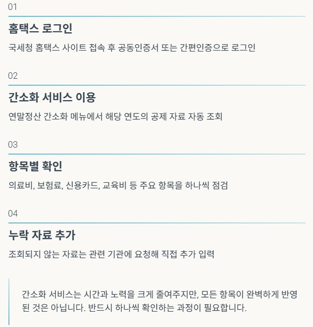 홈택스 자료를 기준으로 누락 여부만 점검하고, 이해가 되지 않는 부분은 공식 안내 자료를 참고하는 방식이 가장 안정적입니다. 복잡한 판단이 필요한 경우에는 세무 전문가 상담을 통해 확인하는 것도 하나의 방법이 될 수 있습니다.