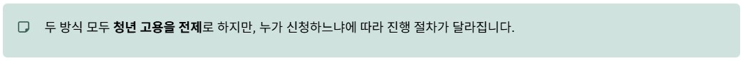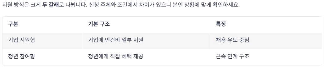 지원 방식은 크게 두 갈래로 나뉩니다. 기업이 청년을 채용하면 인건비 일부를 지원받는 구조와, 청년이 취업 후 일정 요건을 충족하면 혜택이 이어지는 구조입니다. 두 방식 모두 청년 고용을 전제로 하지만, 신청 주체와 조건에서 차이가 있습니다.