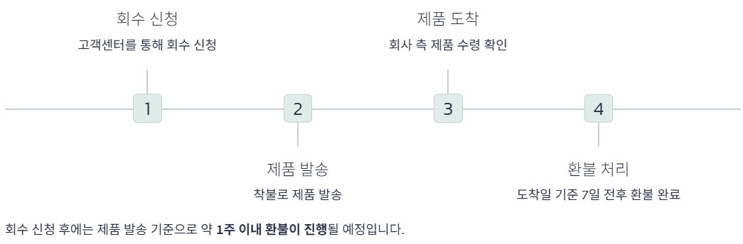 회수 신청 후에는 제품 발송 기준으로 약 1주 이내 환불이 진행될 예정이며, 제품 도착일 기준 7일 전후로 처리됩니다. 회수 제품은 착불로 발송하면 됩니다.