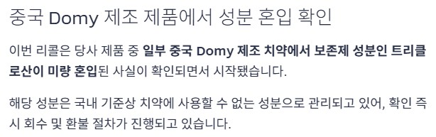 이번 리콜은 당사 제품 중 일부 중국 Domy 제조 치약에서 보존제 성분인 트리클로산이 미량 혼입된 사실이 확인되면서 시작됐습니다. 해당 성분은 국내 기준상 치약에 사용할 수 없는 성분으로 관리되고 있어, 확인 즉시 회수 및 환불 절차가 진행되고 있습니다.
