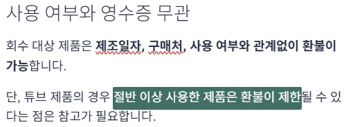 회수 대상 제품은 제조일자, 구매처, 사용 여부와 관계없이 환불이 가능합니다. 단 튜브 제품의 경우 절반 이상 사용한 제품은 환불이 제한될 수 있다는 점은 참고가 필요합니다.
