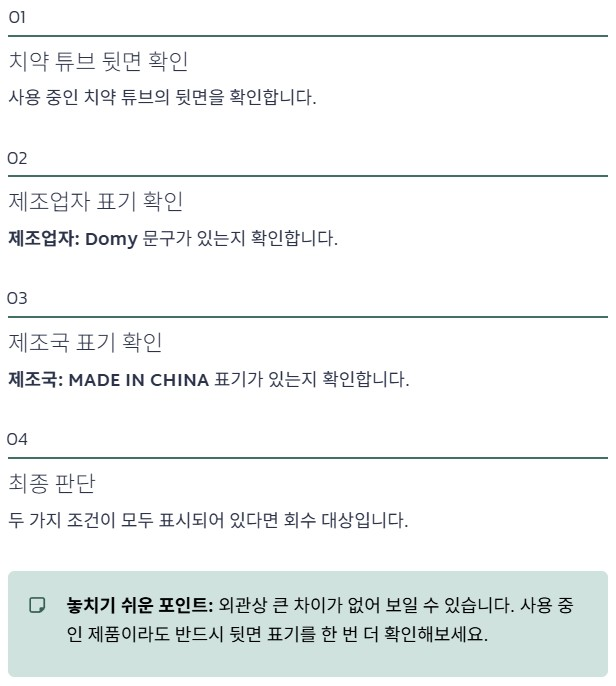 회수 대상 여부는 어렵지 않게 확인할 수 있습니다. 치약 튜브 뒷면에서 제조업자 Domy 표기와 제조국 MADE IN CHINA 문구가 있는지 확인하면 됩니다. 이 두 가지 조건이 모두 표시돼 있다면 회수 대상일 가능성이 높습니다.