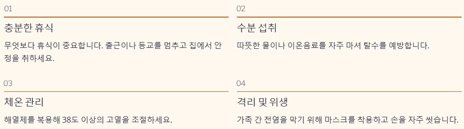 초기에는 충분한 휴식과 수분 섭취가 가장 중요합니다. 해열제를 복용해 체온을 조절하고, 무리한 외출이나 출근·등교는 피해야 합니다. 증상이 심해지거나 고열이 이틀 이상 지속되면 병원 진료를 준비하는 것이 필요합니다.