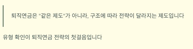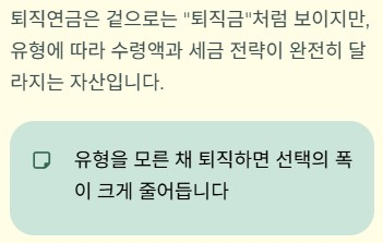 퇴직연금은 이름은 같지만 구조는 완전히 다릅니다. 겉으로는 “퇴직금”처럼 보이지만, 유형에 따라 수령액과 세금 전략이 달라지는 자산입니다. 유형을 모른 채 퇴직하면, 선택의 폭이 크게 줄어듭니다.