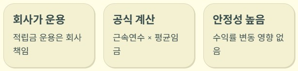 DB형은 회사가 적립금을 운용하고, 퇴직 시 받을 금액이 공식에 따라 계산됩니다. 근속연수와 평균임금이 핵심 기준입니다. 근로자는 운용에 직접 관여하지 않기 때문에 수익률 변동에 따른 차이는 없습니다. 대신 회사의 재무 상황과 제도 운영 방식이 중요하게 작용합니다. 안정성은 높지만, 추가 수익을 기대하는 구조는 아닙니다.