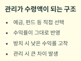 DC형은 회사가 매년 부담금을 적립하면, 그 이후 운용은 근로자 본인이 선택합니다. 예금, 펀드 등 상품 구성에 따라 수익률이 달라지고, 그 수익이 그대로 퇴직연금 적립금에 반영됩니다. 운용을 방치했다면 낮은 수익률로 굳어질 수 있고, 관리했다면 같은 근속연수라도 결과는 크게 달라질 수 있습니다. DC형은 말 그대로 “관리가 수령액이 되는 구조”입니다.