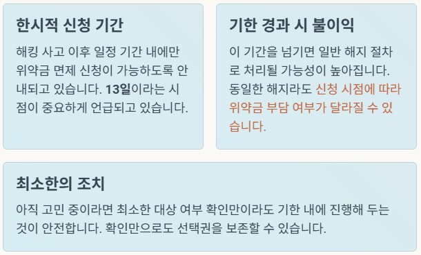 이번 사안에서 가장 많이 놓치는 부분이 바로 기한입니다. 해킹 사고 이후 일정 기간 내에만 위약금 면제 신청이 가능하도록 안내되는 경우가 있어, 13일까지라는 시점이 중요하게 언급되고 있습니다.